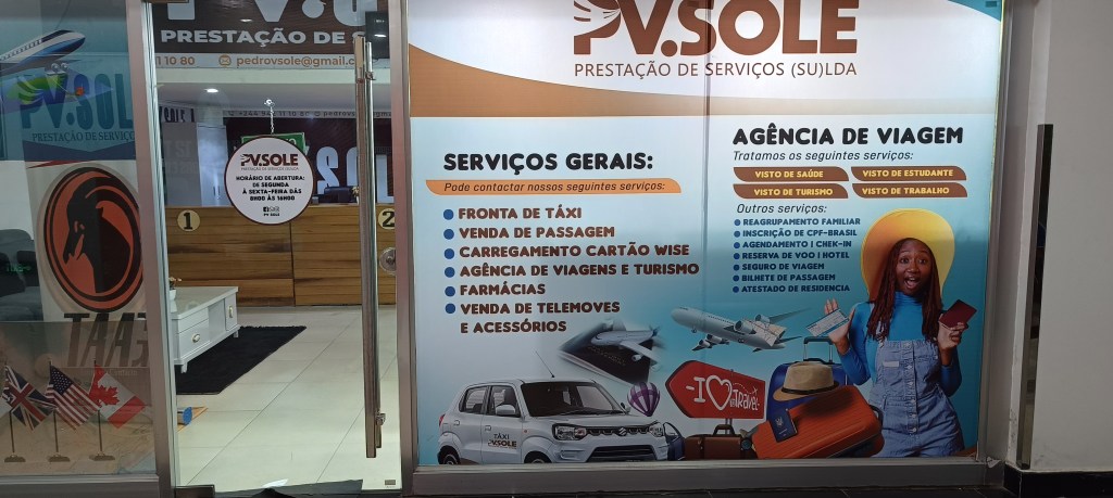 Pvsole prestação de serviços somos uma de prestação de serviços temos : agência de viagem, taxi privado, vendas de bilhetes de passagem internacionais, padaria e farmacia, e vendas de telemóveis.